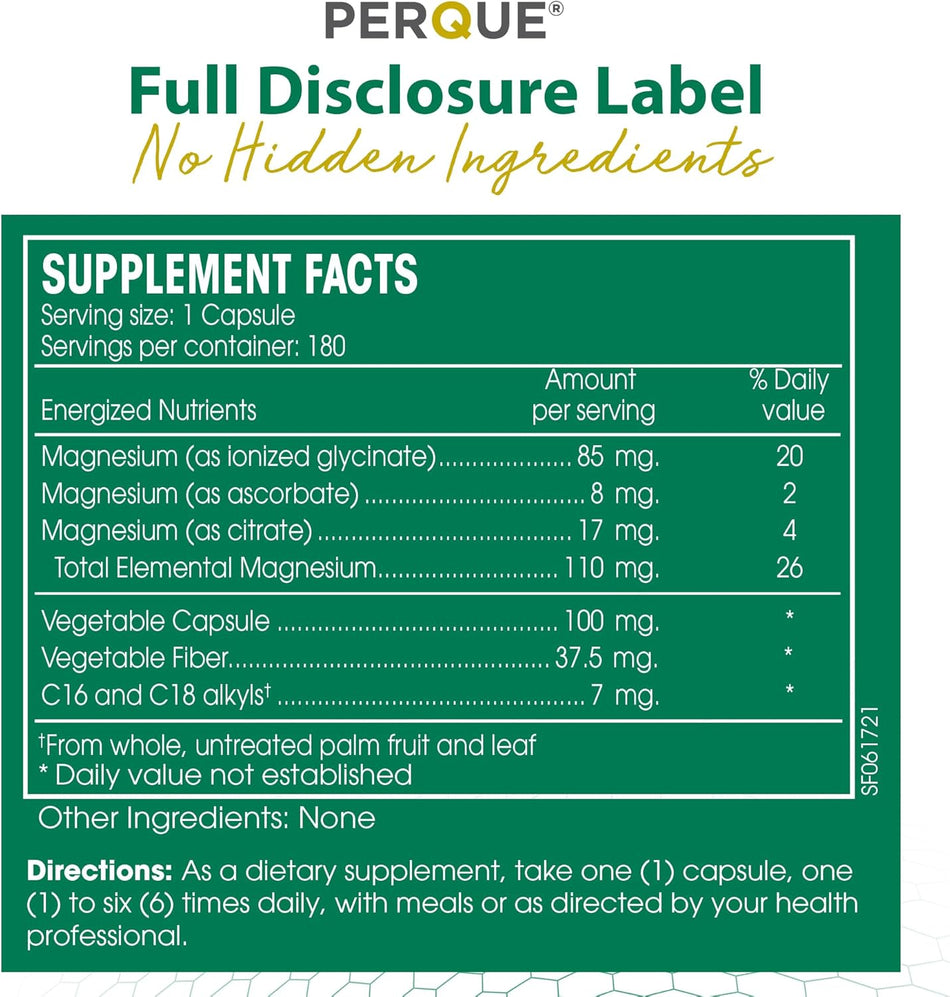 Support muscle relaxation, heart health, and overall wellness with Perque Magnesium Plus Guard. Formulated for optimal absorption, this magnesium supplement combines highly bioavailable magnesium citrate with other synergistic nutrients to promote energy production, nerve function, and healthy bones. Ideal for those with magnesium deficiencies or increased nutritional needs, it helps ease muscle tension, support restful sleep, and maintain cardiovascular health. The 180-capsule bottle provides a convenient supply for long-term use, making it easy to maintain daily magnesium intake for optimal health and performance.